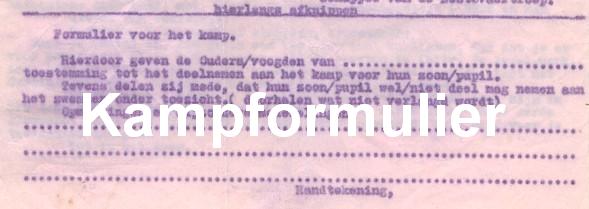 Onder getekende geeft hierbij toestemming voor het deelnemen van zijn/haar zoon aan het Pinksterkamp / het instructie-weekend / het zomerkamp 1971. Tevens verklaart hij/zij geen bezwaar te hebben tegen het onder toezicht zwemmen van zijn/haar zoon. (doorhalen wat niet van toepassing is). Deze strook en het Pinksterkampgeld vóór 22 mei a.s. inleveren. Het Zomerkampgeld en de contributie over het tweede kwartaal a.u.b. voor 12 juni betalen.