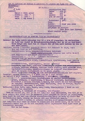 aardappelen 5 kg. boter 125 g. vet 100 g. suiker 200 g. jam of stroop 125 g. havermout 1 pak thee voor een week koffie voor een week cacaopoeder voor een week snijkoek of kaakjes (hoe meer hoe liever) kluit zachte zeep |