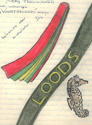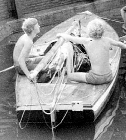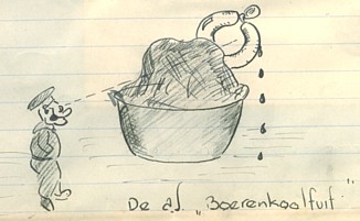 Geschreeuw, gescheld, geklaag. Gemodder om te roeien, gelach. Voor anker... Oefenen in het roeien. Aat de Leeuw neemt onverwacht een duik en komt al borrelend boven met indianengegil van de anderen. Terug naar de kust, ik neem het commando. Alles gaat goed. M’n aspirine-buisje knapt binnenzaks en wordt een zeewater-glaspoeder. De kust in’t zicht, nog even. O wee, een roller!! Bijna ondersteboven. Een Hemelvaartsdag zonder zijn gelijke." (stamlogboek, 1939) |
