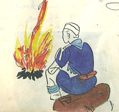 Gezessen brachten we ongeveer drie kwartier in het hordehol door. Daarna kwam schipper Haasnoot ons halen voor de installatie in de stamhut. Hier hingen de St.-Jorisvlag en de vlag van de Watertrappers met het prachtige zeepaardje erop geborduurd. Het licht van de petroleumlamp verspreidde een zachte glans en bescheen de op de tafel gelegen attributen van de installatie.