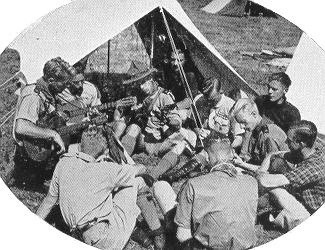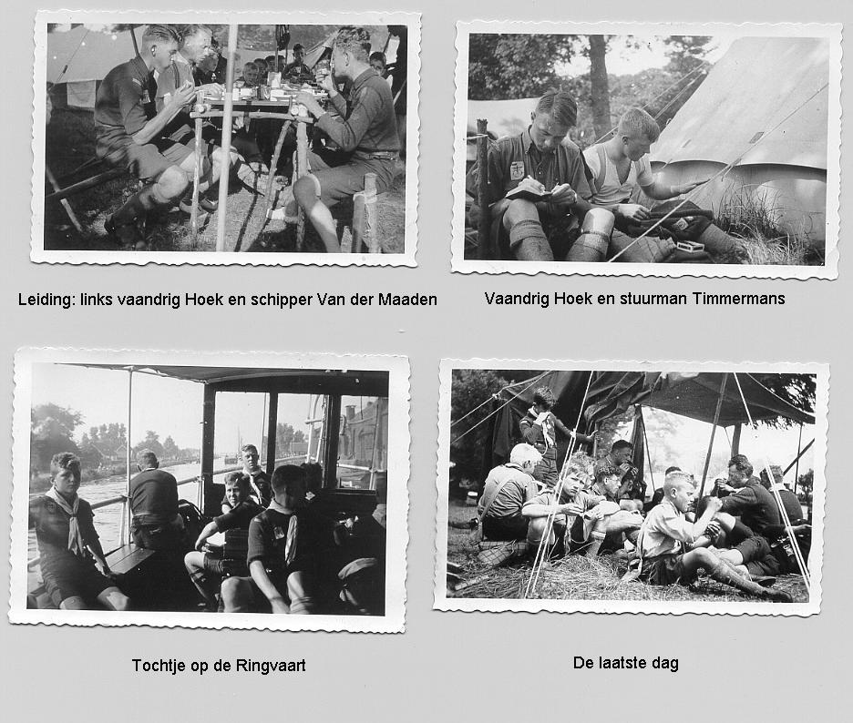 Maandag. "De ouders kwamen ook eens overwippen. 's Avonds groeps-kampvuur, waar we uitgenodigd werden. Vele "kruisvaarders" hadden we als gasten. Kampvuurleider was de groepsleider, de heer Van der Maaden, geassisteerd door vaandrig Niek Hoek en aspirant-stuurman Timmermans, kortweg Timmy geheten."